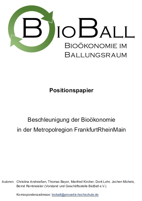 Mit dem Positionspapier "Beschleunigung der Bioökonomie in der Metropolregion FrankfurtRheinMain" möchte der Innovationsraum BioBall Akteure aus Politik, öffentlicher Verwaltung, Wirtschaft, Forschungs- und Lehreinrichtungen ansprechen.