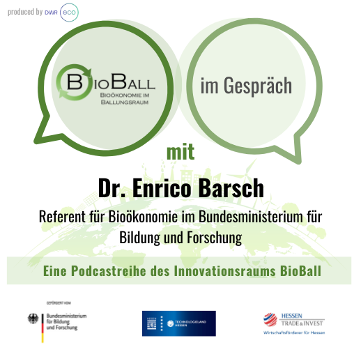 Unser Gast ist Dr. Enrico Barsch, Referent für Bioökonomie im Bundesministerium für Bildung und Forschung (BMBF). Hr. Barsch ist ursprünglich Chemiker, beschäftigt sich insbesondere mit der industriellen Bioökonomie im Referat und ist damit verantwortlich für den Innovationsraum BioBall und die drei weiteren Innovationsräume.